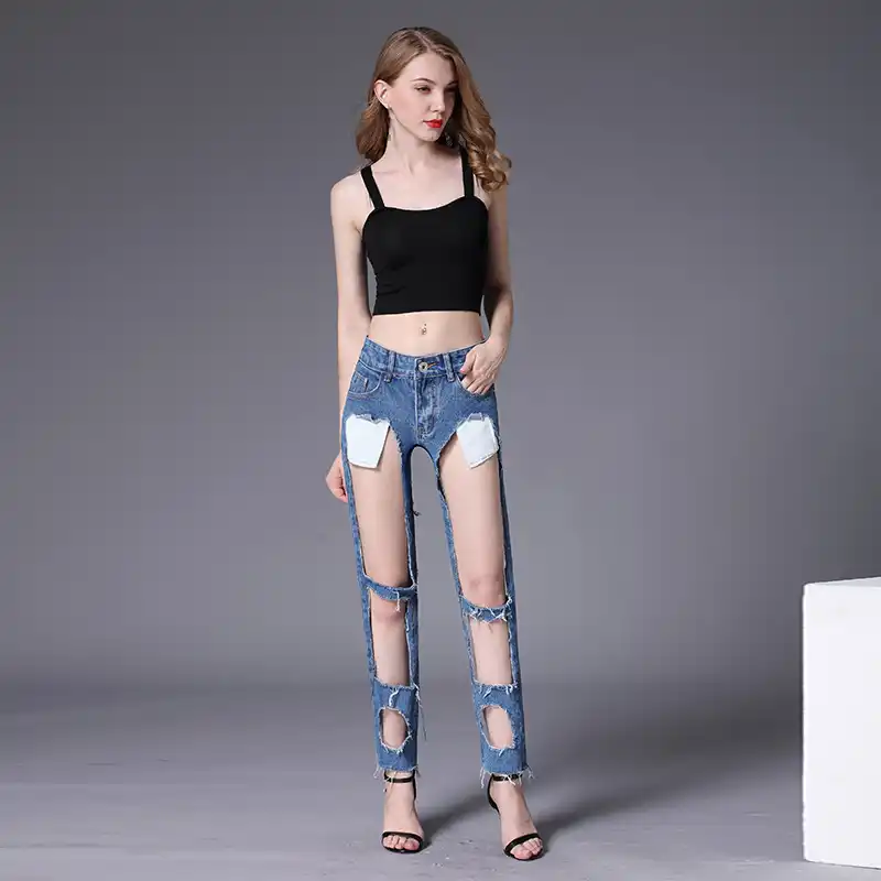 Explosion Models Europe Sexy Hollow Jeans Women Solid Color Big