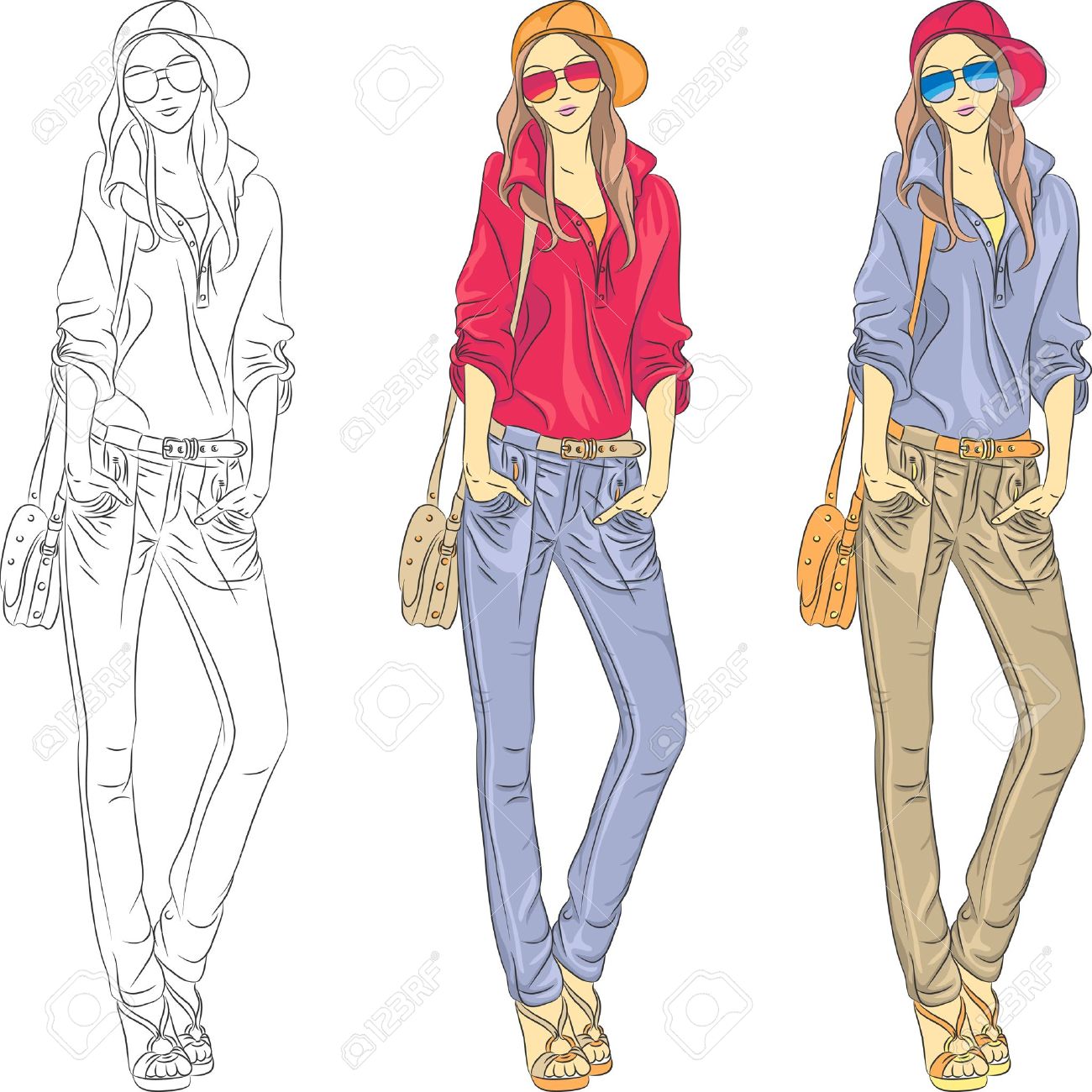 Vector Set Beautiful Fashion Girls Top Models In Jeans Shirt
